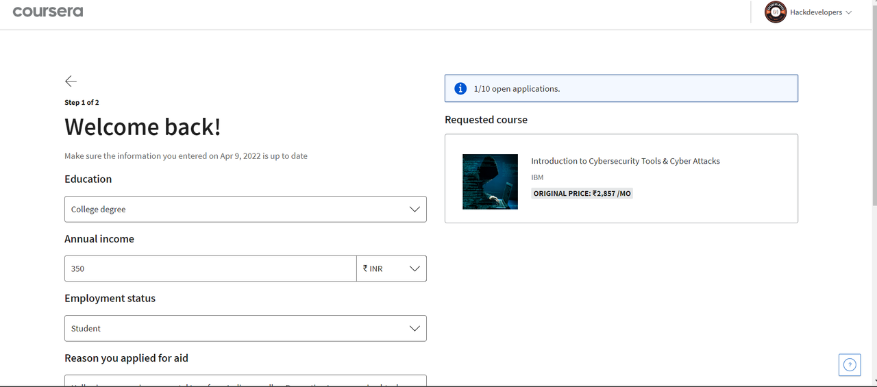 Hello sir my name is hackdevelopers. I am from India, Delhi. Presenting I am pursuing BTech from your college name Computer Science (CS) branch. I am applying for Financial aid for the course "Introduction to Cybersecurity Tools & Cyber Attacks". I do not have any other source of income and I don't earn enough money and I can not afford the course fee at this time. Financial Aid for this course will help me get valuable knowledge and skills in computer language. I searched for many jobs to earn money but due to this pandemic, no one is giving me any type of job in Delhi. I am very hard working and want to learn many new skills and I promise you that I will complete this course with honesty, sincerity, and dedication on the apert these skills are not thought to me in my college and after 5 years down the line it helps me to grow faster in my field. For my father, it's hard to pay college fees so for it very hard so I can ask for other expenses so please understand and allow me to do this course. Once again I request you please receive my application and allow me to join this course.